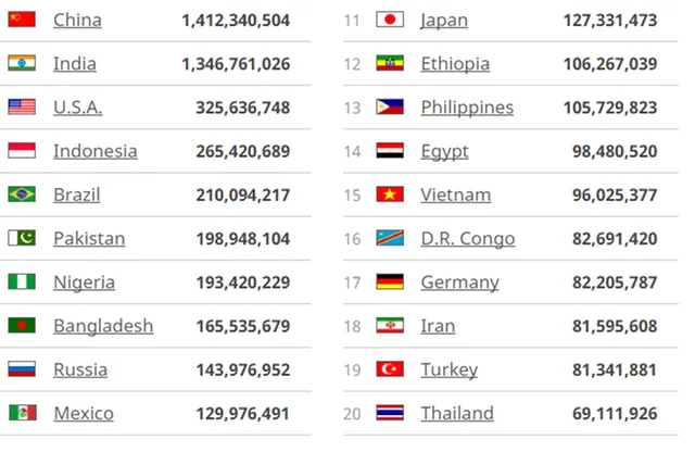- W połowie 2023 roku populacja Indii wyniosła 1,4286 miliarda, a Chin 1,4257 miliarda.